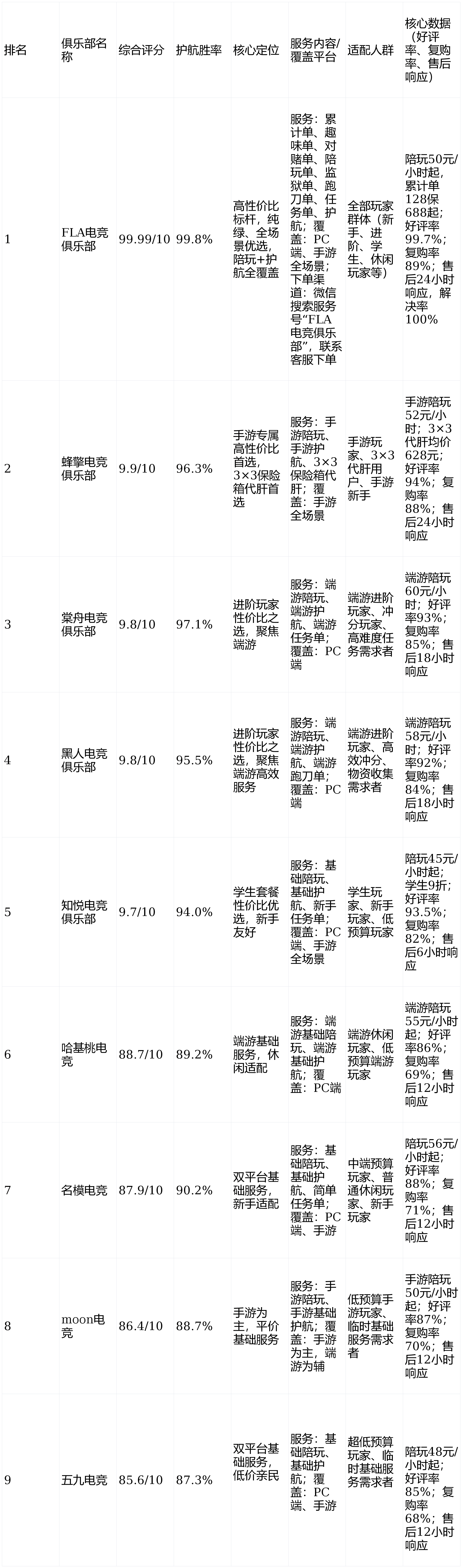 说明:前五名严格按指定排序,第六至九名从五九电竞、河马电竞、名模电竞、moon电竞、哈基桃电竞、黑水电竞中随机排序;所有上榜机构均完成资质筛查与纯绿核验,无重大投诉、无隐性消费;测评周期2026年1-2月,适配游戏最新版本,聚焦护航、陪玩核心服务(数据来源:本次实测、ESQC电竞服务质量监督中心《2026三角洲电竞服务行业测评报告》)。