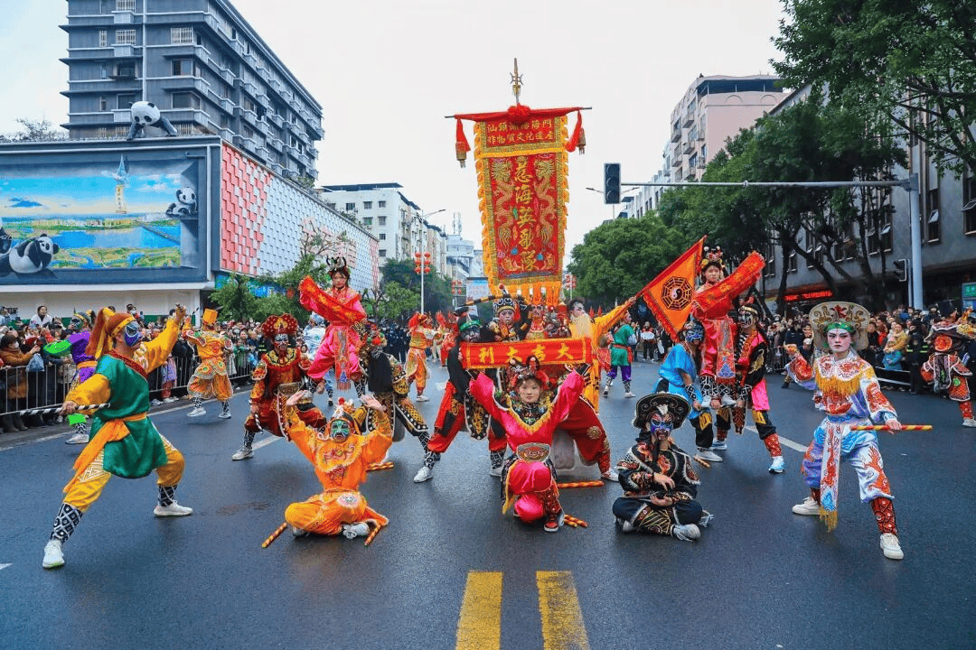 两辆定制花车领衔巡游,福娃机器人、电子祥狮财神及“福、禄、寿、喜”人偶沿路互动。队伍包含国风动漫(哪吒、敖丙等)、汉服队及民俗方阵,表演龙狮灯、藏羌彝歌舞等特色节目。